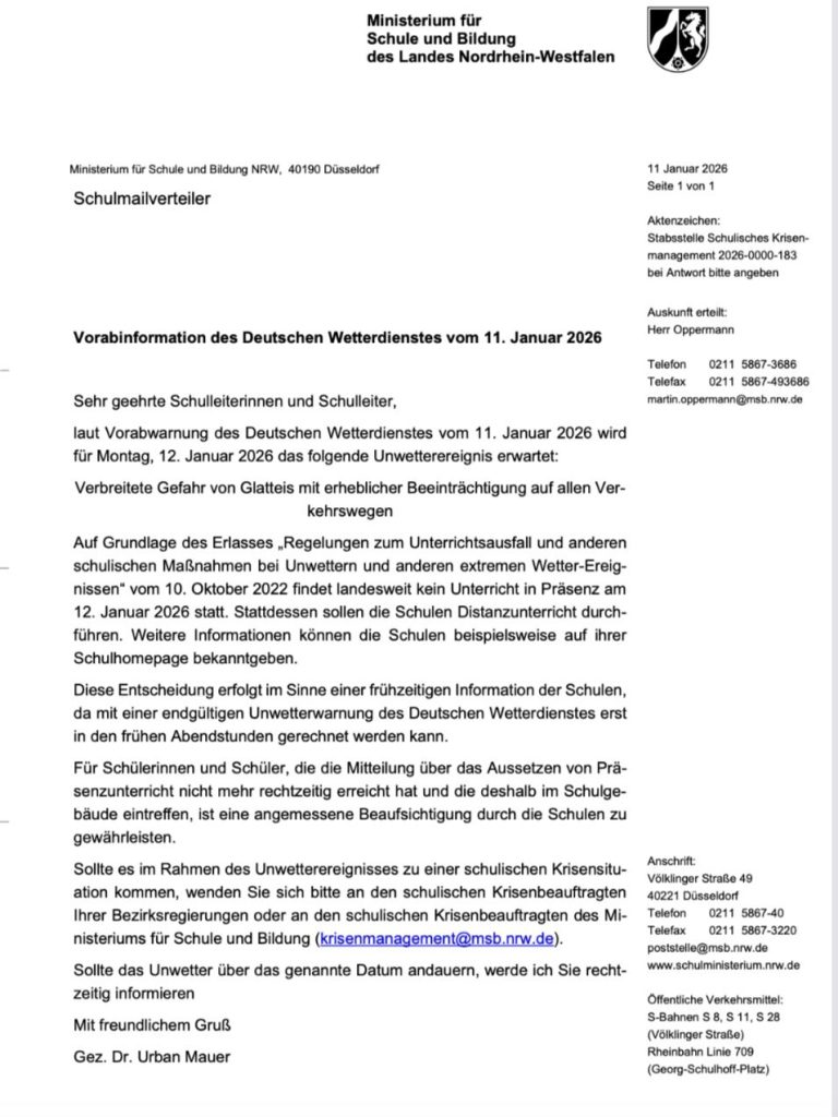 Am 12. Januar 2026 findet aufgrund der Unwetterwarnung (siehe Vorabinformation des Deutschen Wetterdienstes vom 11. Januar 2026) landesweit kein Unterricht in Präsenz statt.
